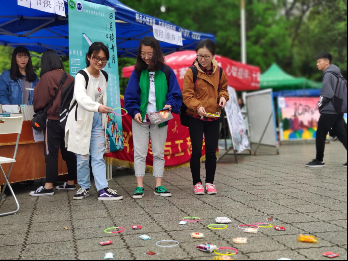本次活动的摆点现场就举行了“以书换书”与“爱心捐书”的活动,为了让更多人参与到读书月的活动中,还有“公益义卖”与“小游戏”,除此之外,赢得小游戏的同学更有精美小礼物相赠。