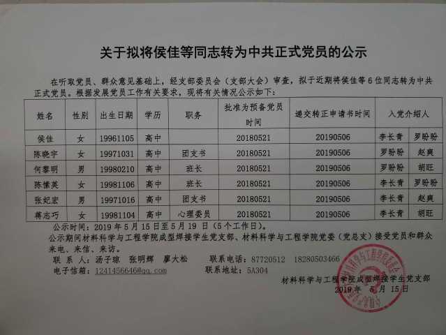 关于拟将侯佳等同志转为中共正式党员的公示