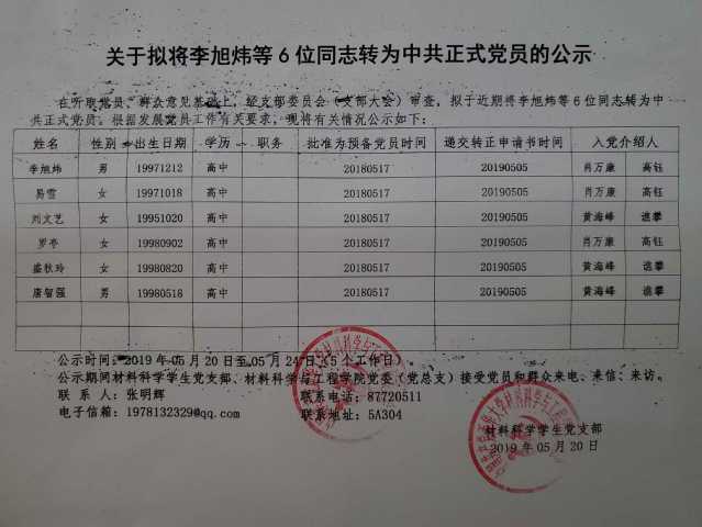 关于拟将李旭伟等6位同志转为中共正式党员的公示