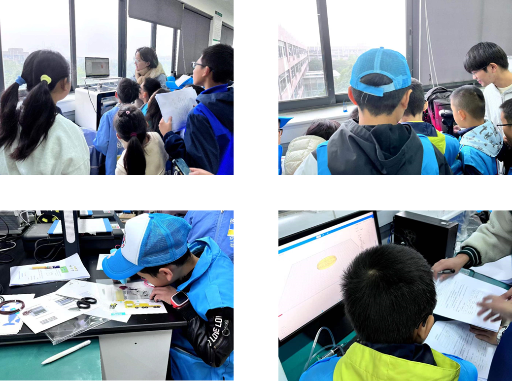 随后,志愿者张静生动形象的向同学们介绍了3D打印的相关知识,从2D打印引出3D打印,介绍了3D打印的概念、原理、优点及3D打印流程。同学们一边做笔记一边跟着张静同学的思路积极互动举手回答问题,现场气氛活跃。随后,同学们分成四组,在志愿者的带领下按照三维建模设计-三维扫描-分层切片-3D打印的步骤,深度体验了从前处理-3D打印加工-后处理的全流程3D打印。在三维建模设计环节,志愿者赵袁向同学们简要介绍了NX软件的使用,并以圆柱几何模型为例,热情耐心的向同学们讲解了如何在NX中通过简单的“拉伸”动作从一个圆形创建出一个圆柱体模型,现场引发了同学们阵阵惊叹。随后,同学们在赵袁的指导下有序进行NX软件的实操,现场热情高涨。在三维扫描环节,志愿者漆卓豪为同学们讲解了三维扫描的原理及操作步骤,并现场演示了三维扫描仪的扫描过程。同学们兴致勃勃,对高科技的应用充满好奇。在切片环节,志愿者谯宇帆向同学们介绍了3D打印切片软件的使用步骤,并引导同学们完成打印制件切片参数如打印层厚、打印温度、填充率、底板温度等的设定,并在软件中直观展示了2D平面层层叠加成为三维实体的过程。在随后的3D打印环节,同学们将切好片的文件导入到3D打印机设备中,进行3D打印加工。在打印制件的间隙,同学们还体验了3D打印笔,化身“神笔马良”,充分发挥了自己的想象力和创造力。