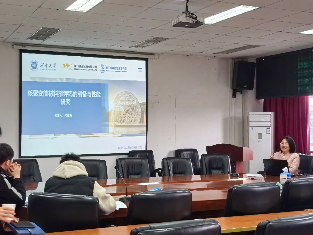 梁孟霞老师以“核聚变能材料掺钾钨的制备与性能研究”为题,从研究背景,高钾含量掺杂钨块材的工程化制备技术,掺钾钨块材料的微结构与性能,基于掺钾钨块材的偏滤器模块设计与性能评价四个部分进行了详细的介绍。