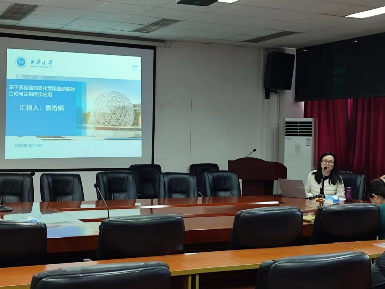袁奇娟老师以“基于氨基酸的支化型聚酯酰胺的合成与生物医学应用”为题,汇报内容有利用环糊精的主客体识别行为,构建功能材料(自愈合材料&形状记忆材料);寻求针对SIS膜的改性新策略,构建兼具有ROS清除和抗菌性的生物粘附性SIS贴片;探索脱细胞SIS膜丰富的化学设计和多样的材料形式等几部分内容进行了详细的介绍。