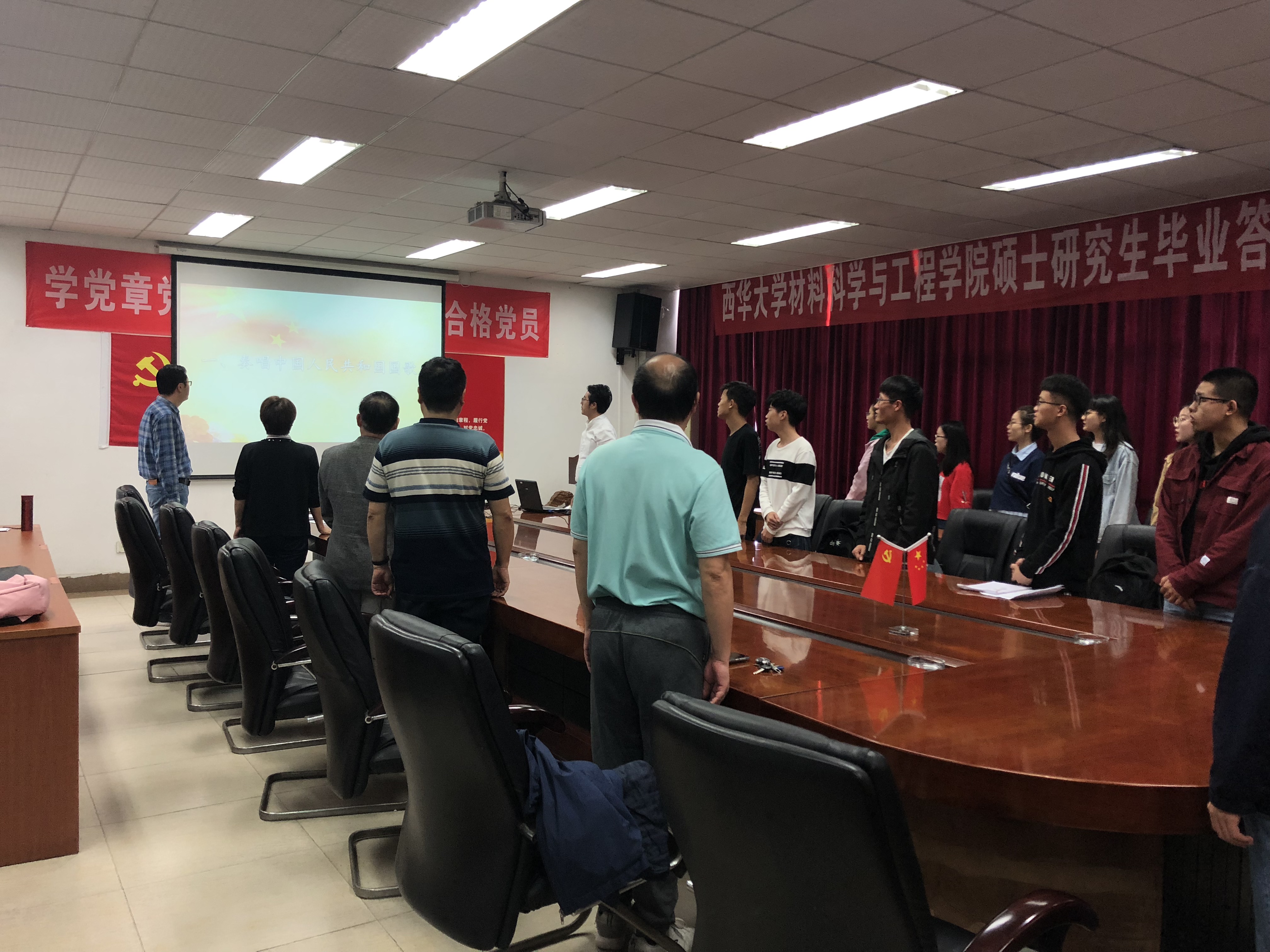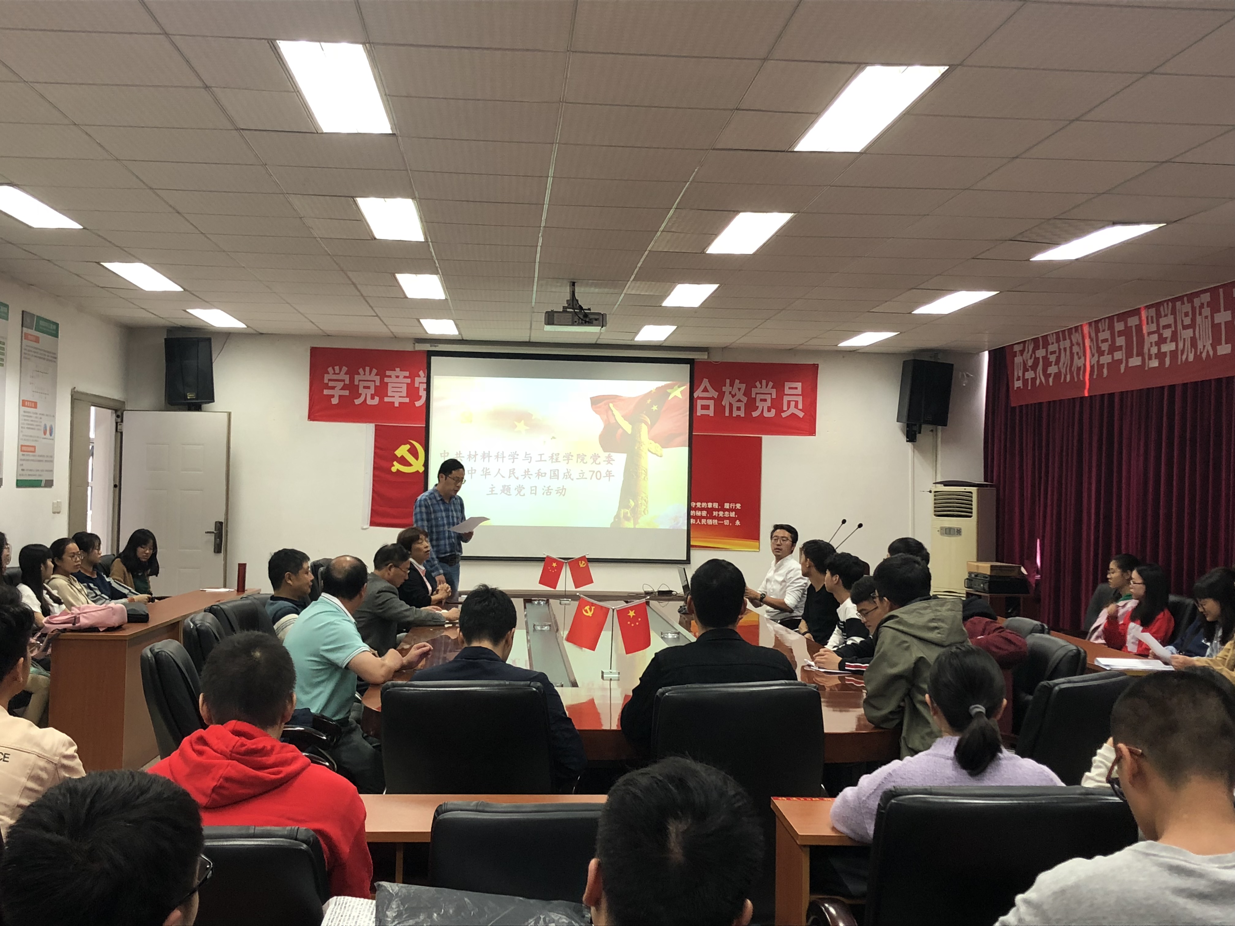 9月29日中午,在迎接中华人民共和国成立70周年之际,学院党委开展“我和我的祖国”主题党日活动之“重温入党誓词和新发展的党员宣誓仪式”。材料学院党委书记党委委员,教工支部书记,学生党总支书记,学院辅导员以及学生支部委员,新发展党员,部分学生党员代表出席,仪式由党委副书记马洪波主持。