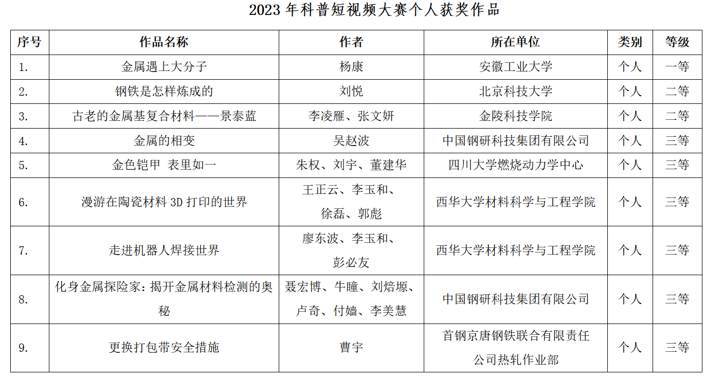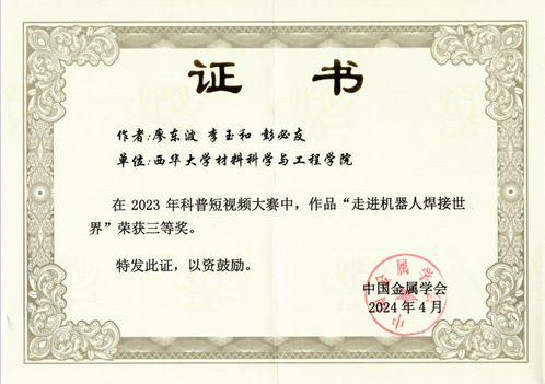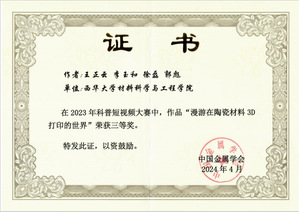 近日,中国金属学会开展了2023年科普短视频大赛评审工作,经过形式审查、专家评审及结果公示,我校伟德国际1946源于英国《漫游在陶瓷材料3D打印的世界》和《走进机器人焊接世界》两个作品喜获中国金属学会科普短视频大赛三等奖。