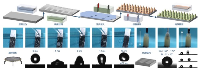 (1)技术理论:采用晶体修饰策略诱导金属离子靶向吸附与螺旋生长构建纳米锥支撑层,利用无氟浸渍策略在支撑层表面构筑兼具高弹跳和定向运输功能化的超疏水自清洁涂层。(2)涂层特性:优异的超疏水性,出色的自清洁功能,良好的防污去污性,极低的表面张力,独有的高弹跳性和定向运输功能性,一定的耐蚀耐磨性,等。(3)应用领域:高压线表面防冰防雪,零部件表面防腐防污,玻璃表面功能化自清洁,特定系统定向油水分离,电极界面气泡运输,微流体装置和能量转换系统,等。