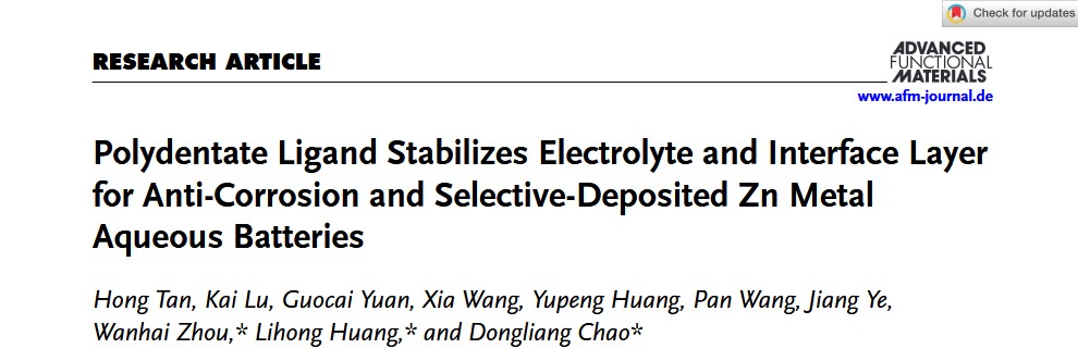 近日,伟德国际1946源于英国黄丽宏教授与复旦大学晁栋梁教授合作,在国际顶尖期刊《Advanced Functional Materials》上发表题为“Polydentate Ligand Stabilizes Electrolyte and Interface Layer for Anti-Corrosion and Selective-Deposited Zn Metal Aqueous Batteries”的研究论文。《Advanced Functional Materials》2025年最新影响因子为18.5,是材料与化学领域的公认顶级期刊(中科院大类/小类一区Top期刊),同时被国际权威的自然指数评选为顶级期刊之一。论文通讯作者为黄丽宏教授和复旦大学晁栋梁教授,西华大学青年博士谭鸿和硕士研究生芦凯为论文的共同一作,西华大学为第一完成单位。