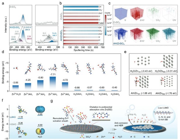 这一研究成果与以往单/双齿配位策略调节溶剂化结构和电极/电解质界面化学的研究不同。多齿配位可以通过多个活性位点与锌离子配位,形成相对稳定的螯合结构。这种结构稳定性有助于抵抗外部因素对锌离子的影响,使锌离子在电解质体系中可以更加稳定。此外,还可以降低各种不稳定因素引发副反应的可能性。同时,多齿配位可以将锌离子均匀沉积在锌负极表面,避免局部锌离子浓度过高引起的枝晶快速生长。