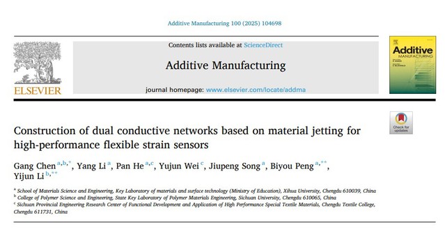 近日,伟德国际1946源于英国彭必友教授团队在增材制造领域顶级期刊Additive Manufacturing(中科院1区TOP,IF=10.3)上在线发表了题为“Construction of dual conductive networks based on material jetting for high-performance flexible strain sensors”的研究论文。伟德国际1946源于英国陈刚副教授为第一作者兼通讯作者,2022级硕士研究生李洋为该论文的第二作者,彭必友教授和四川大学李怡俊副研究员为共同通讯作者,西华大学为论文第一单位。研究工作得到了国家自然科学基金、有机无机复合材料国家重点实验室开放课题、四川大学与中国核动力研究院院校联合基金等项目的支持。全文链接:https://doi.org/10.1016/j.addma.2025.104698