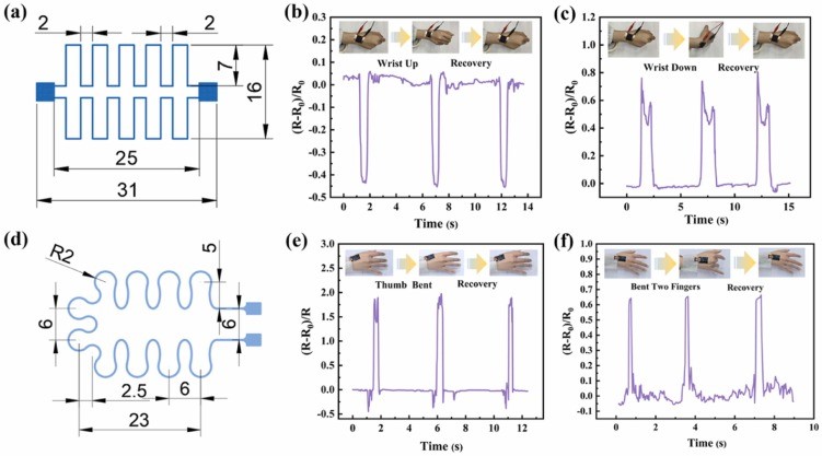随着智能穿戴设备和物联网技术的快速发展,柔性应变传感器在健康监测、人工智能及机器人等领域展现出广阔的应用前景。提升柔性传感器的灵敏度、应变响应范围和可靠性一直是实际应用中亟待解决的问题。通过对传感器导电网络进行图案化构筑,不仅可有效放大对微应变的响应,还能优化应力分布,显著提升传感器整体性能。据此,彭必友教授团队利用气溶胶喷射打印技术(AJP)非接触、高精度及宽材料适应性的优势,制备了一种具有双导电网络结构的柔性应变传感器,并实现了导电网络结构的多种图案化形态与尺寸调控。所制备的典型蜿蜒形传感器展现了0.6–80%的应变响应范围和高达31.2的GF灵敏度。此外,传感器在经历2000次循环加载后,仍能稳定输出信号,具有良好的循环稳定性。进一步的,借助AJP技术的图案化优势,研究团队制备了不同网格密度的应变传感器。结果表明,灵敏度与网格密度呈非线性关系,在2×6网格配置下,传感器的GF最高可达47.52,突出了图案化设计的优势。基于AJP打印的应变传感器在人体运动监测、摩尔斯编码通信及UAV飞行状态监测等应用场景中表现出色。该研究不仅成功实现了在柔性衬底表面构建图案化的导电网络结构,还为其它柔性电子器件的设计与构筑提供了新思路。