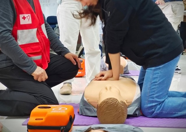“黄金四分钟”里练真功,在应急救援技能培训阶段,副队长张钦尧借助模拟人教具分步拆解心肺复苏(CPR)操作规范:“胸外按压需定位两乳头连线中点,以每分钟100-120次频率、5-6厘米深度下压,身体垂直发力避免倾斜。”志愿者们分组实操时,在反复纠错中形成“肌肉记忆”。