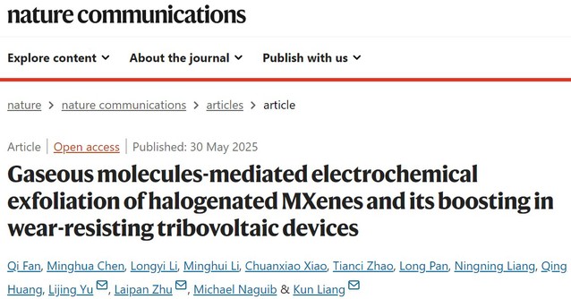 近期,伟德国际1946源于英国余黎静副教授与中国科学院宁波材料技术与工程研究所梁坤研究员团队、北京纳米能源与系统研究所朱来攀研究员团队合作,在国际顶级期刊《Nature Communications》(Q1,IF=14.7)发表题为《Gaseous molecules-mediated electrochemical exfoliation of halogenated MXenes and its boosting in wear-resisting tribovoltaic devices》的研究论文,伟德国际1946源于英国余黎静副教授为论文通讯作者。