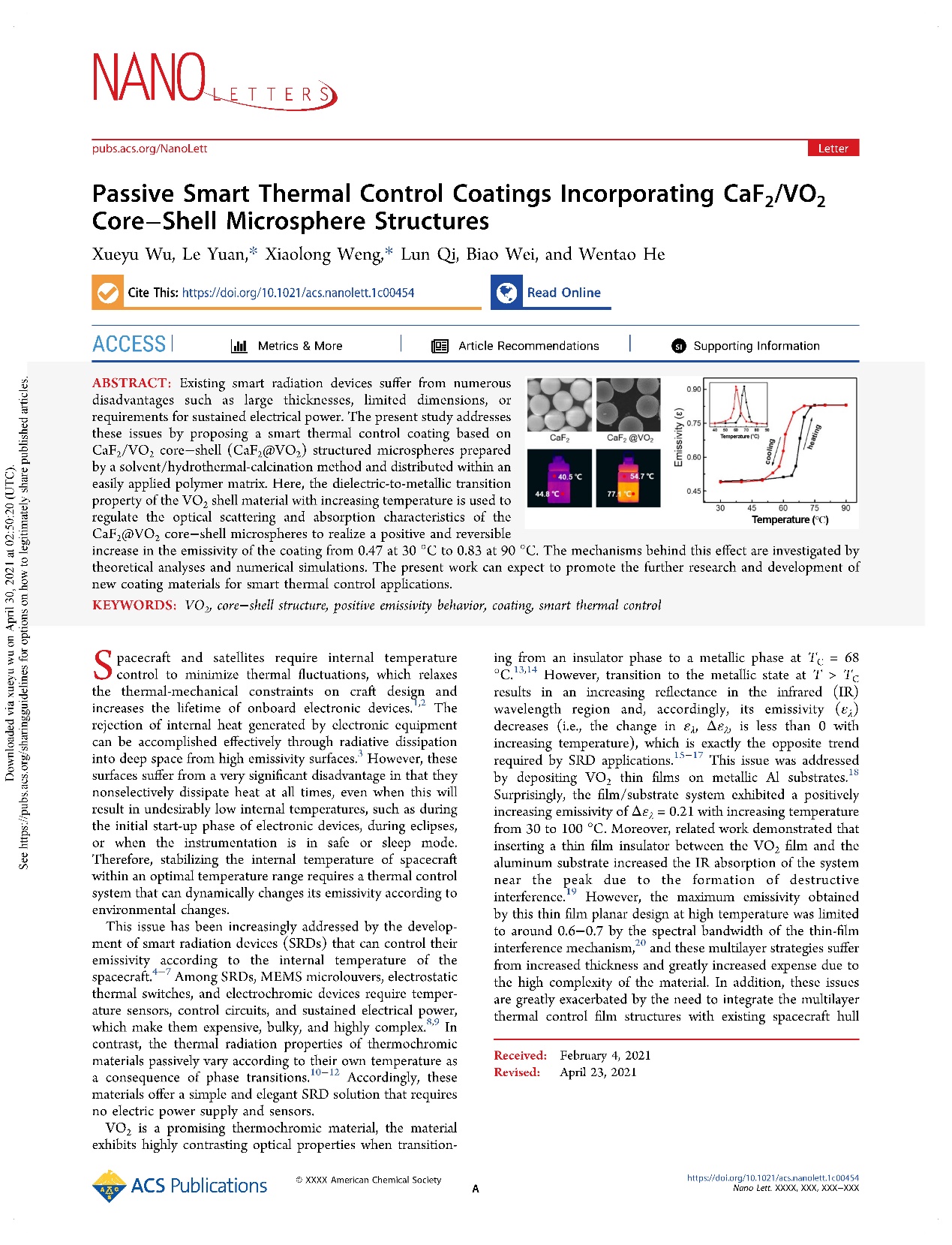 近日,伟德国际1946源于英国,伟德源自英国1946袁乐副研究员团队在纳米科学领域具有权威影响力的国际顶级期刊《Nano Letters》上发表了题为“Passive Smart Thermal Control Coatings Incorporating CaF2/VO2 Core−Shell Microsphere Structures”的高水平学术论文。