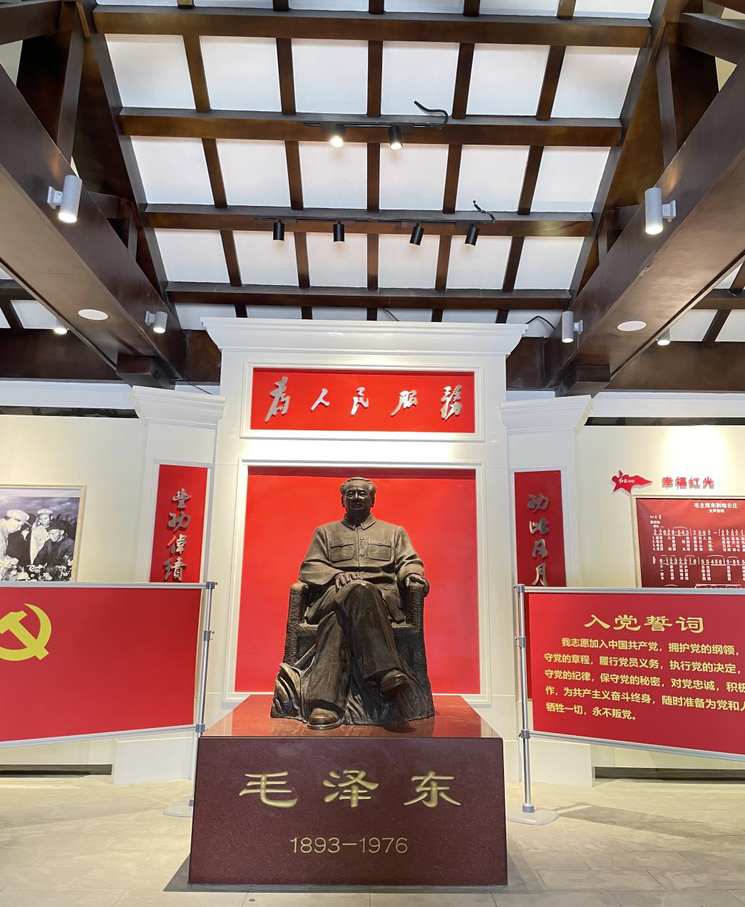 大家怀着崇敬的心情走进了纪念馆,在纪念展厅正中央,塑立着一尊毛主席铜像,“为人民服务”五个大字金光闪闪。展厅里收藏着毛主席视察红光的历史图片,谈话稿件的影印件,后院陈列着20世纪50年代川西坝子农家人的生产、生活用具等历史实物,生动展现了当时劳动人民的生活场景。