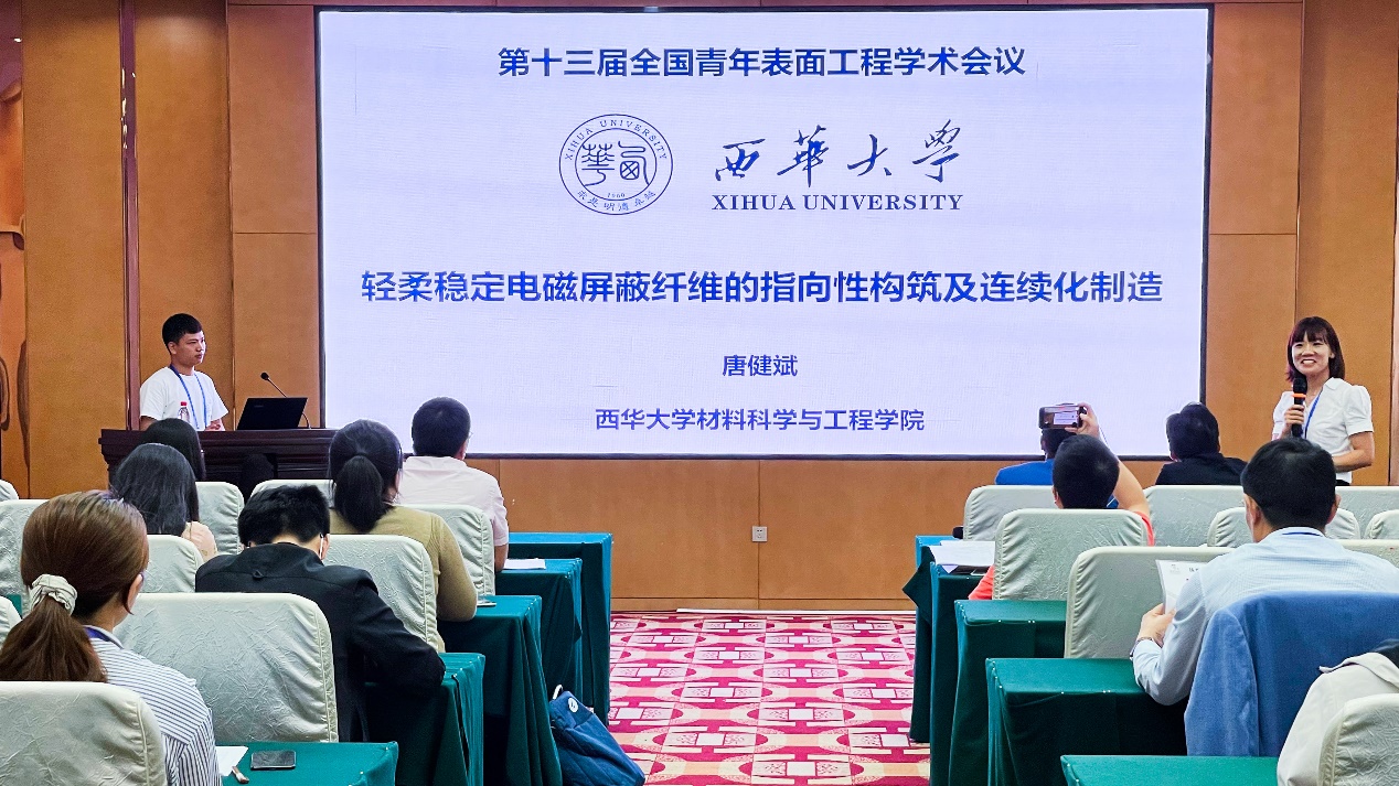 16日下午,我校伟德国际1946源于英国硕士研究生唐健斌在本次大会分会场作了题为“轻柔稳定电磁屏蔽纤维的指向性构筑及连续化制造”学术报告。报告主要针对我国空天国防等特殊领域轻质/柔性/高强/稳定的屏蔽纤维制造难题,分享了课题组最新成果——以轻柔高强纤维为芯材的“叠层”复合纤维,针对连续化制造过程中的关键科学问题提出了独有的设计思想与解决方案,并展示了自主研发的产线。同时,分享了发表于Surface & Coatings Technology国际期刊上的最新研究成果。在提问环节,会场反响热烈,纷纷提问,唐健斌一一作答,并就学科热点问题与专家进行深入交流。