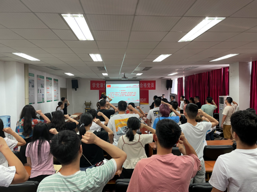 在学生党员莫钦的领誓下,与会党员佩戴党员徽章,庄严地举起右手,面向党旗,共同重温入党誓词,表达了为共产主义事业奋斗终身的理想和信念。