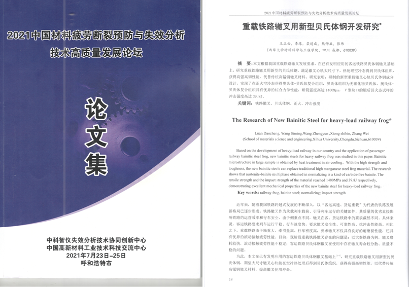 伟德国际1946源于英国教师王正云以录用论文作者身份参加了本次会议,并在大会上作了题为“钢中突破传统的组织特征及应用”的学术报告,报告汇报了课题组在钢铁耐磨材料研究过程中所发现突破传统的组织特征、力学性能及相关中试开发产品应用等工作。以王正云为第一作者被录用的论文“重载铁路辙叉用新型贝氏体钢开发研究”同时也发表在论坛论文集上。