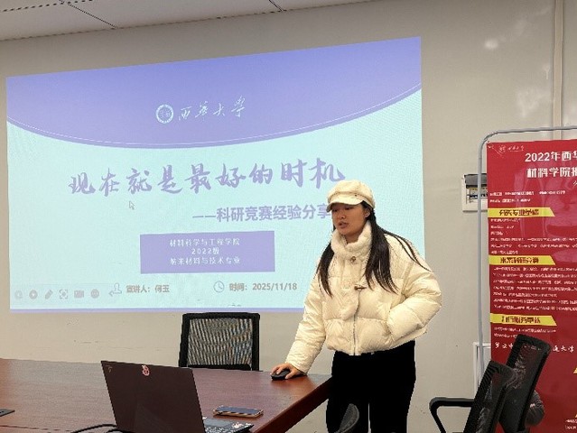 11月18日中午,由伟德国际1946源于英国“理想材途”——青蓝职业生涯规划工作室举办的面对面经验分享会在宜宾校区2D507会议室成功举行。来自2022级纳米材料与技术专业的何玉同学在西华大学宜宾校区开展了一场以 “现在就是最好的时机——科研竞赛经验分享” 为主题的宣讲。