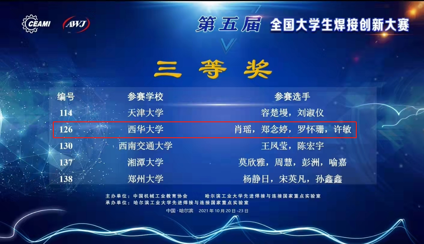 2021年10月20日-23日,第五届全国大学生焊接创新大赛在哈尔滨举行,本届大赛由中国机械工业教育协会和哈尔滨工业大学先进焊接与连接国家重点实验室共同发起和主办。来自清华大学、哈尔滨工业大学、天津大学、西北工业大学、吉林大学、中南大学、西南交通大学、西南石油大学、西华大学等62所高校的220件作品参加决赛,我校首次组织队伍参赛,并最终获得一等奖1项、二等奖1项、三等奖1项的优异成绩。