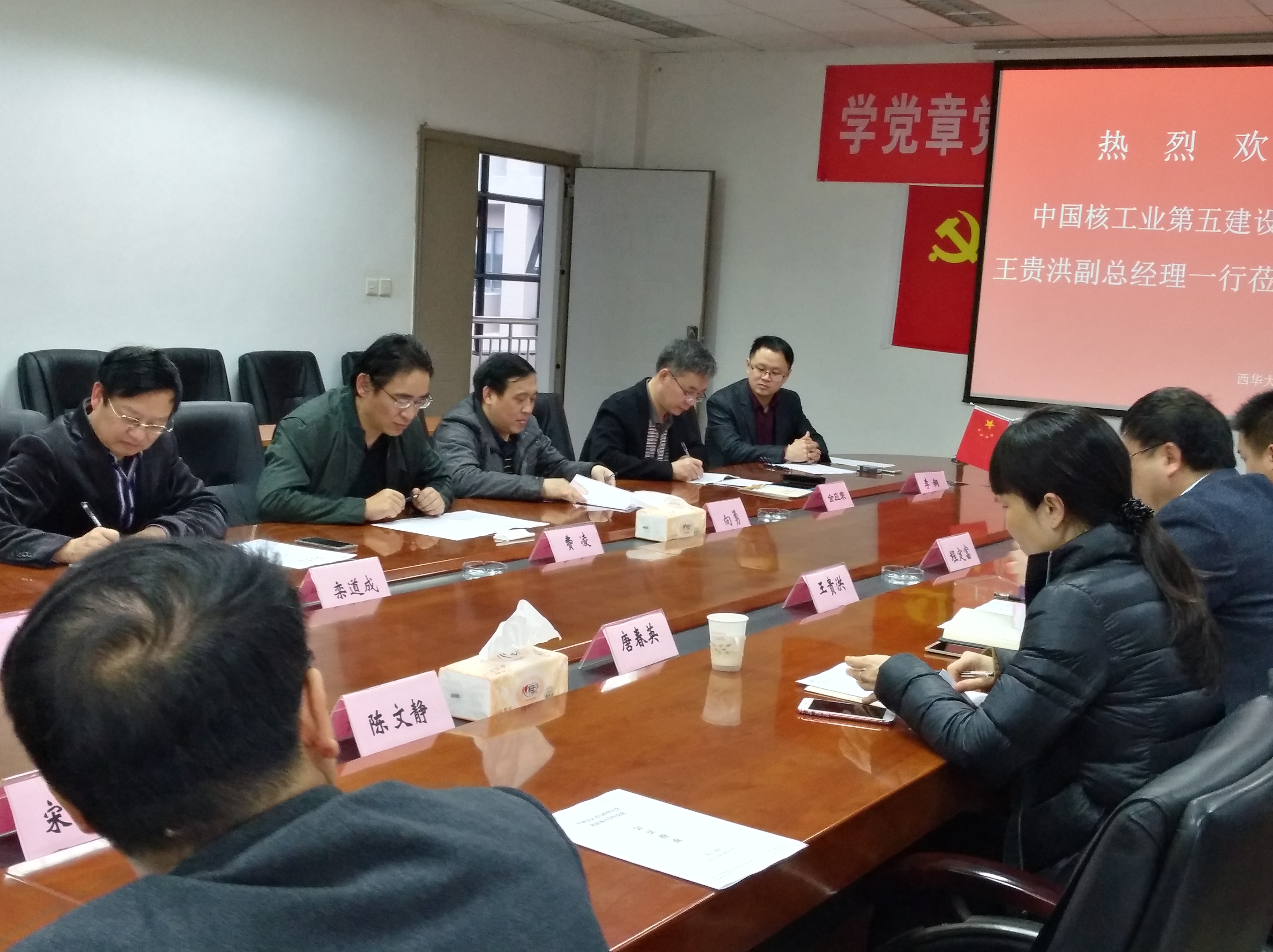 中国核工业第五建设有限公司王贵洪副总首先对学校的热情接待表示了感谢。然后简要介绍了中国核工业第五建设有限公司的历史沿革,并表示,为了技术革新,中国核工业第五建设有限公司从2015年起,加大了在技术研发方面的投入,同时与上海交通大学、西华大学等高校建立了联系,并与这些高校创建了联合实验室,完成了多项应用型研究课题的研究工作,并做到了合作研究的科研成果马上就能在生产现场应用起来,力争与各高校一道努力做到“产、学、研、用”相结合。王贵洪副总特别提到,由西华大学李铜老师牵头研制的超音频电磁感应加热技术及设备、风管自动焊接工装专机、自动送丝的手工TIG焊接专机已交付中国核工业第五建设有限公司使用,受到了现场施工试用的工程师和技师们的一致好评。