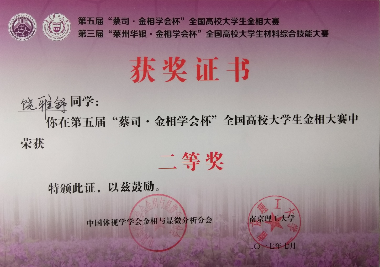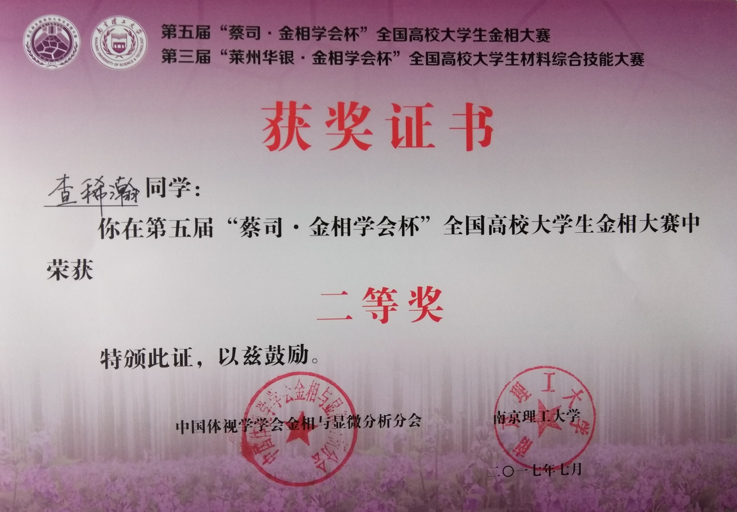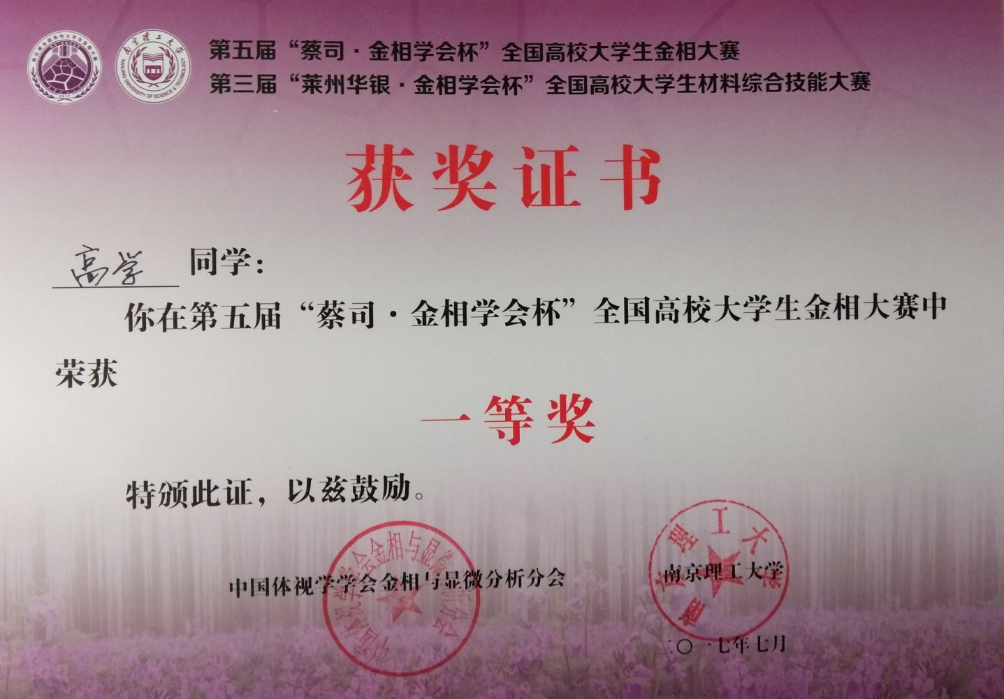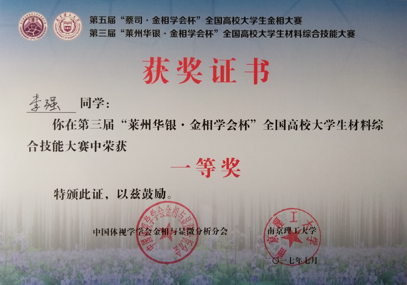 近日,第五届“蔡司·金相学会杯”全国高校大学生金相大赛暨第三届“莱州华银·金相学会角逐杯”全国高校大学生材料综合技能大赛在南京理工大学举行。经过三天的激烈角逐,我校李强同学获材料综合技能大赛一等奖,高学同学获金相大赛一等奖,饶雅舒、查稀瀚同学获金相大赛二等奖,向军、饶丽获“优秀指导教师”称号。