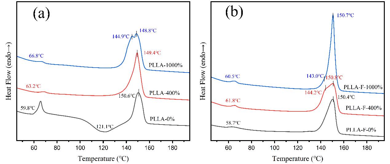 Figure 1 DSC curves of (a) before and (b) after foamed PLLA samples with different draw ratio