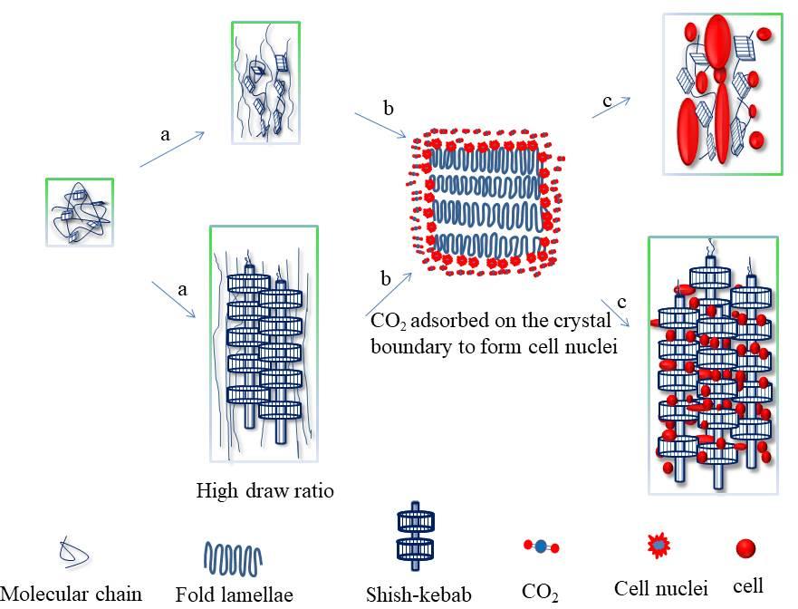 Figure 5 Schematic representations for the mechanisms of oriented foaming, (a) die drawing with different draw ratios, (b) SC-CO2 ectothermal treatment and (c) cell growth process
