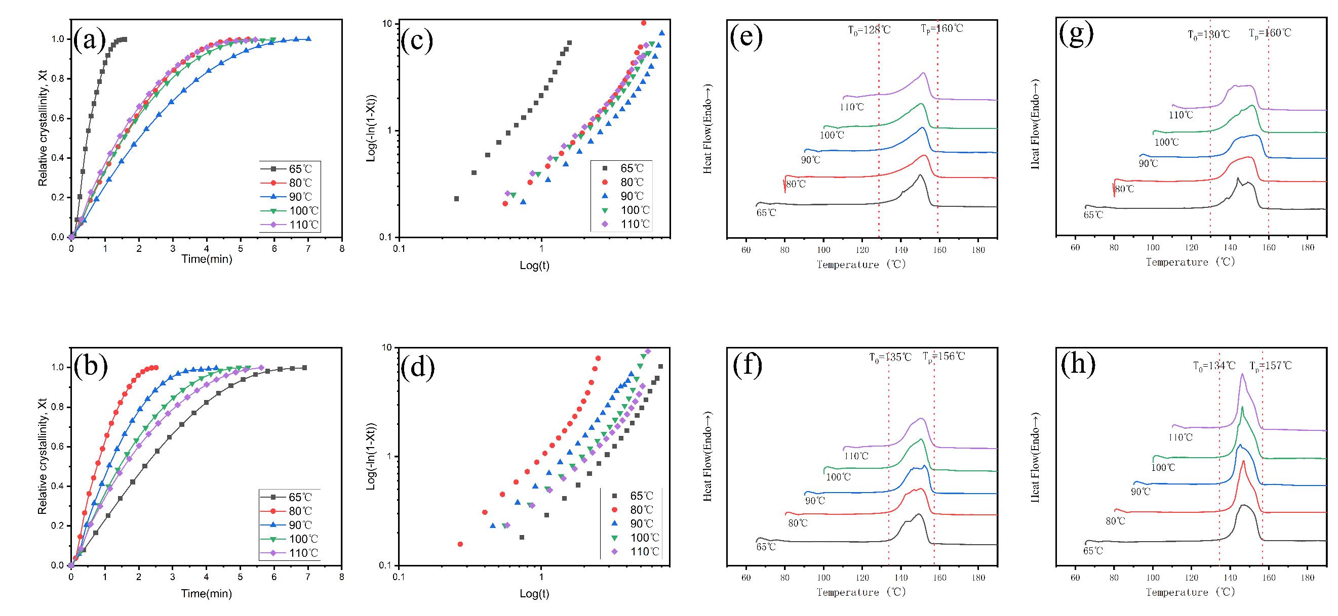 Figure 3 (a) Relative crystallinity (Xt) versus time (t) of PLLA-F-400% and (b) PLLA-F-1000% at 65, 80, 90,100 and 110℃. Avrami plots of log{- ln(1 - X(t))} versus log t for (c) PLLA-F-400% and (d) PLLA-F-1000% at 65, 80, 90,100 and 110℃. Melting curves after isothermal crystallization of (e) PLLA-400%, (g) PLLA-1000%, (f) PLLA-F-400% and (h) PLLA-F-1000%