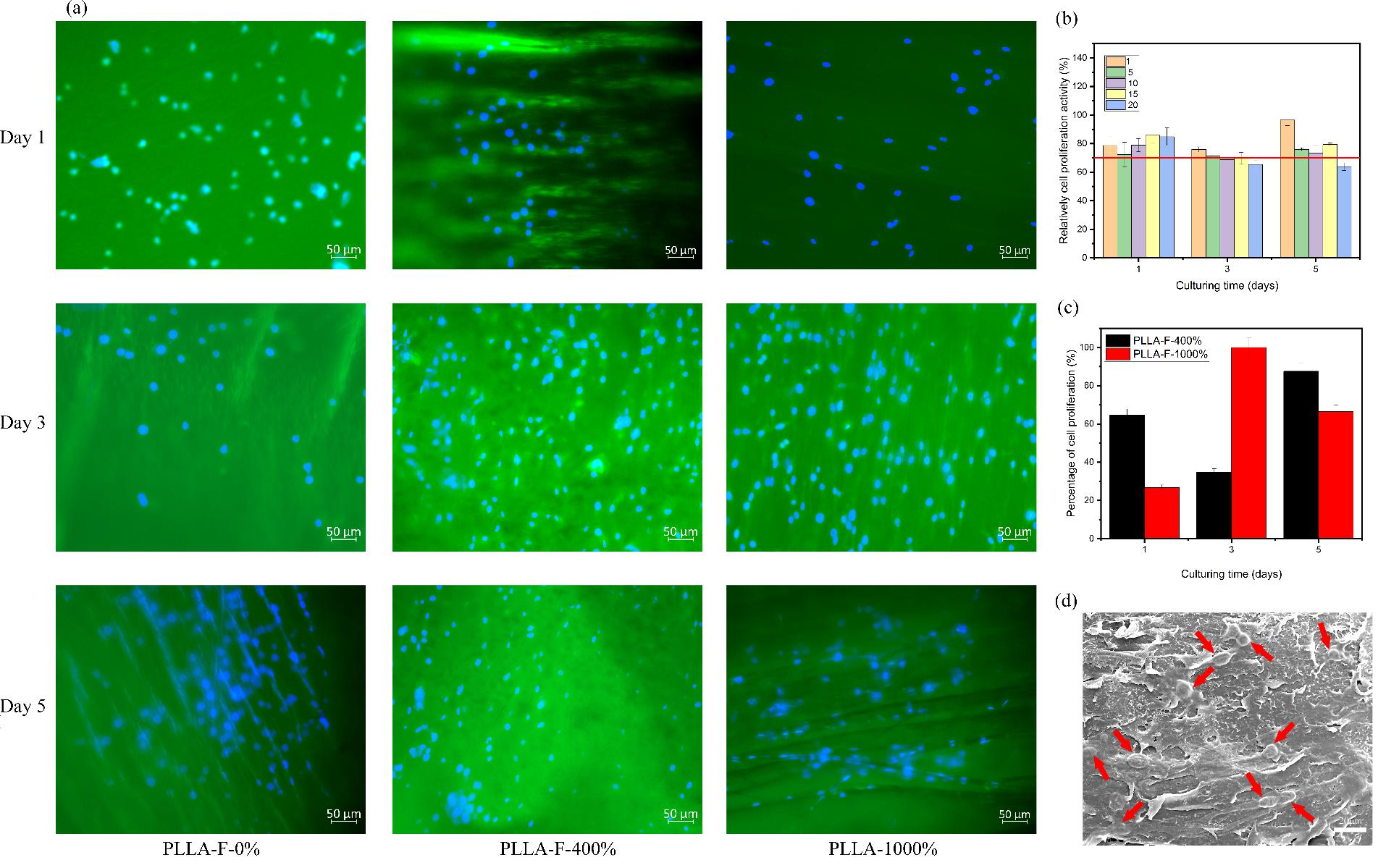 Figure 7 Biological evaluation characterization of oriented microcellular scaffold with different draw ratio, (a) cytoskeleton staining after 1, 3 and 5 days culture, (b) percentage of cell proliferation ability of PLLA-F-1000% in the extracts with different concentrations, (c) normalized relative cell proliferation of PLLA-F-400% and PLLA-F-1000%, (d) SEM of PLLA-F-400% cell morphology after 5 days of culture