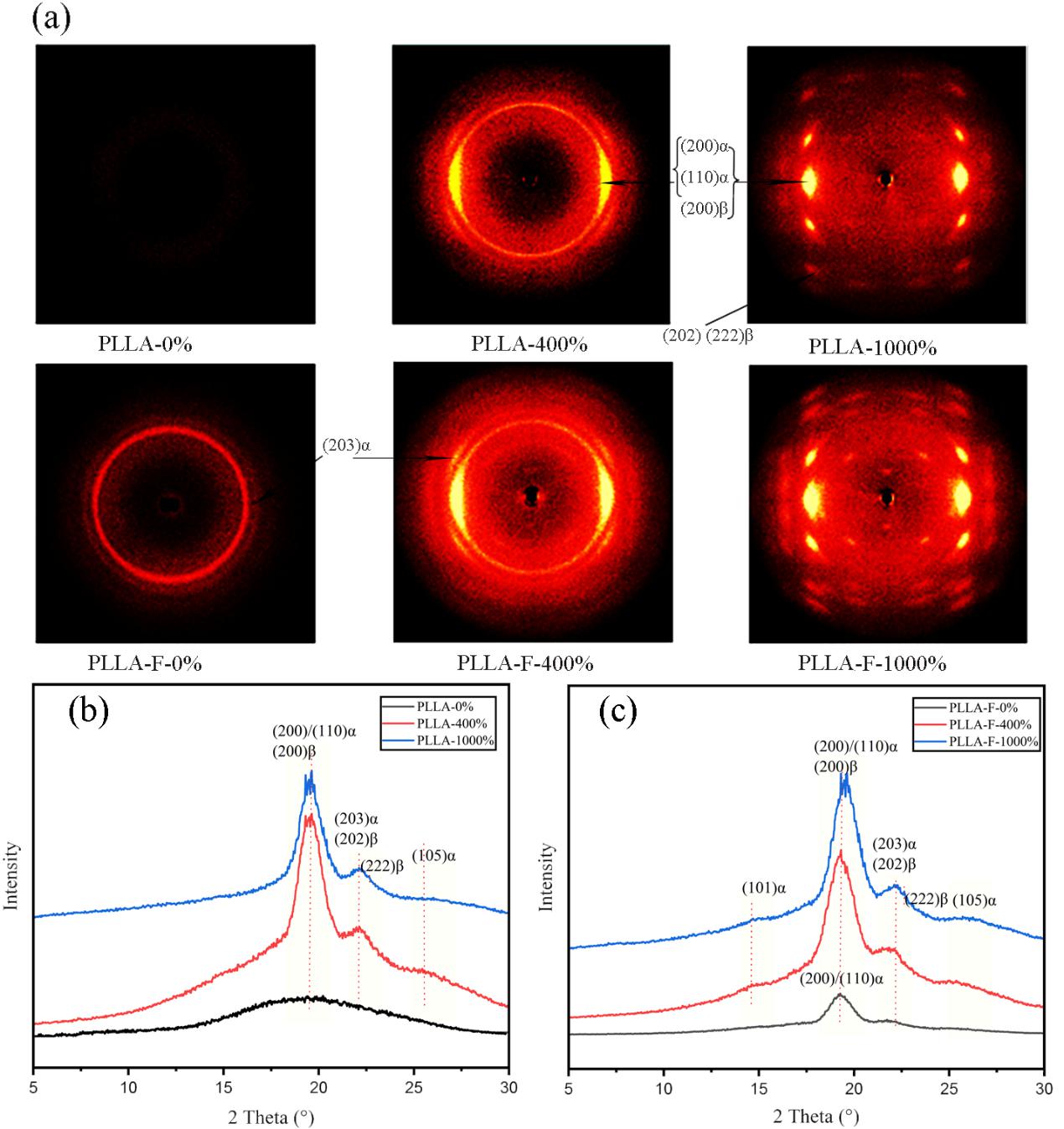 Figure 2 Figure 2 2D-WAXD images of oriented and foamed PLLA samples (a) , 1D-WAXD curves of (b) before and (c) after foamed PLLA samples with different draw ratio