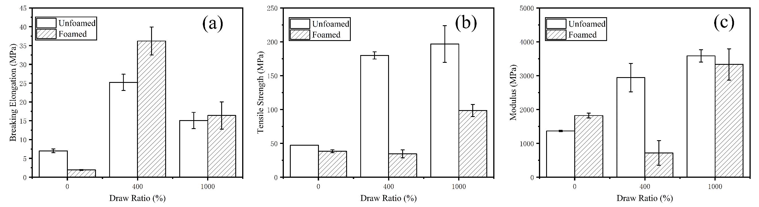 Figure 6 Mechanical properties of oriented and oriented microcellular foaming PLLA samples with different draw ratio