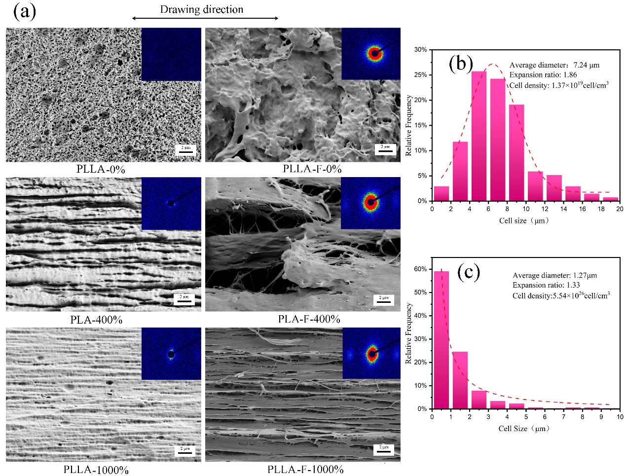 Figure 4 (a) SEM images(10k×) and 2D-SAXS patterns of crystalline morphology of etched fracture surface with different draw ratio PLLA oriented samples and fracture surface for foamed PLLA samples, and cell size distribution of (b) PLLA-F-400% and (c) PLLA-F-1000%