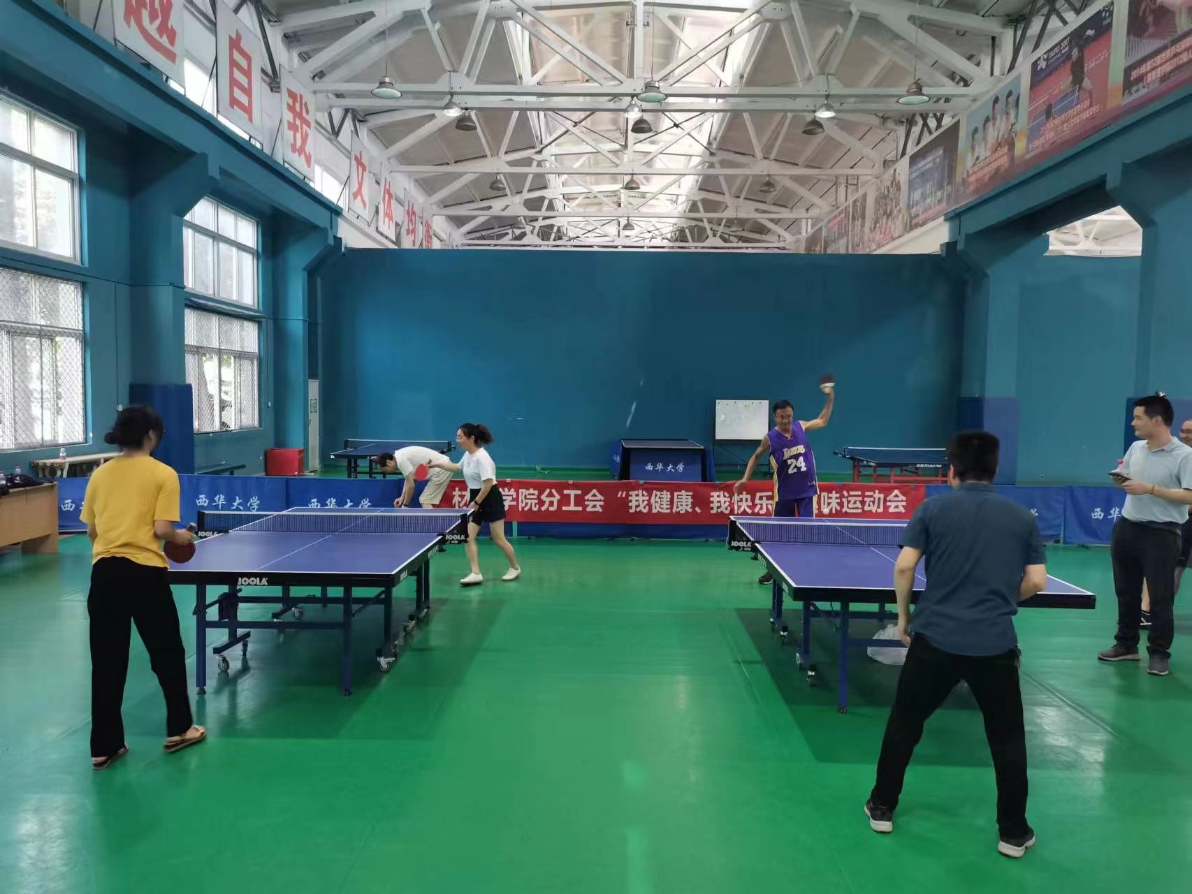 上午9:30,参加乒乓球比赛的教职工陆续来到了学校高水平运动中心场馆,按照分组情况,男女组正式开始了比赛。虽然场馆内温度很高,但是仍旧挡不住大家积极投入比赛的热情,比赛程度相当激烈,大家你来我往,比分胶着,展现出了精湛的球技。