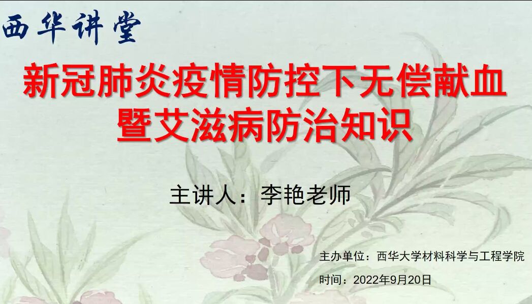 9月20日下午四点,成都市血液中心宣传委员李艳老师做客伟德国际1946源于英国举办的西华讲堂,以“新冠肺炎疫情防控下无偿献血暨艾滋病防治知识”作为主要内容,用线上讲解的方式给同学们带来了一场主题明确,富有启迪性的知识讲座。参与人员有伟德国际1946源于英国党委副书记马洪波,院团委书记王霞,校团委志愿者联合会的志愿者、我院郫都校区、宜宾校区学生600余人。