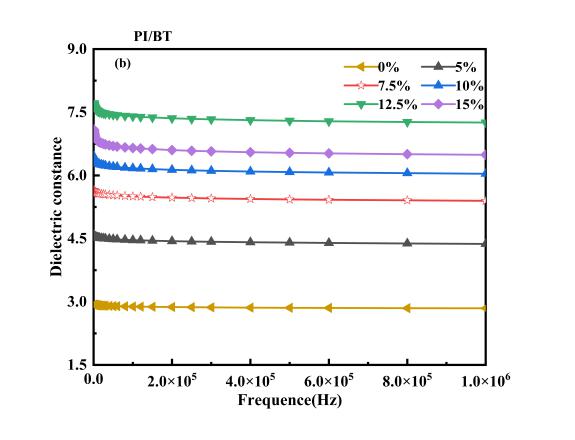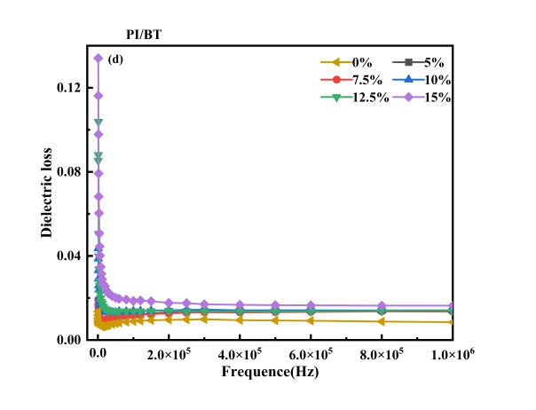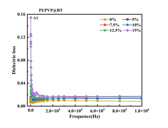 Figure Plots of dielectric constant of PI-PVP@BT (a) and PI-BT (b) dielectric nanocomposite films at different filler mass contents and testing frequency. Plots of dielectric loss of PI-PVP@BT (c) and PI-BT (d) dielectric nanocomposite films at different filler mass contents and testing frequency.