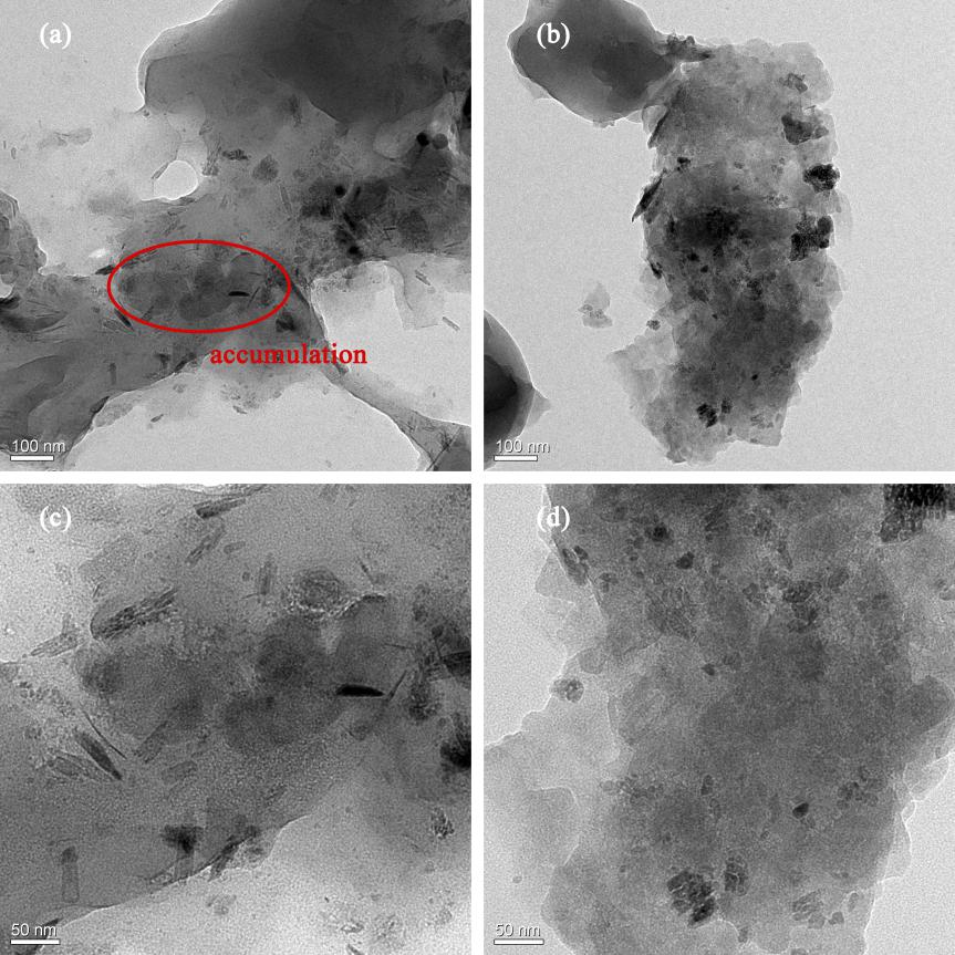 Figure HRTEM images of PI dielectric nanocomposite films. (a) PI-10wt.%BT; (c) high resolution image of (a); (b) PI-10wt.%PVP@BT; (d) high resolution image of (b).