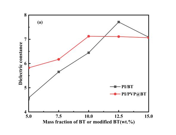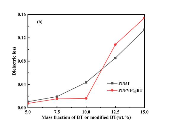 Figure Dielectric constant (a) and dielectric loss (b) of PI-BT and PI-PVP@BT dielectric nanocomposite films with different filler mass contents at 1000 Hz testing frequency.