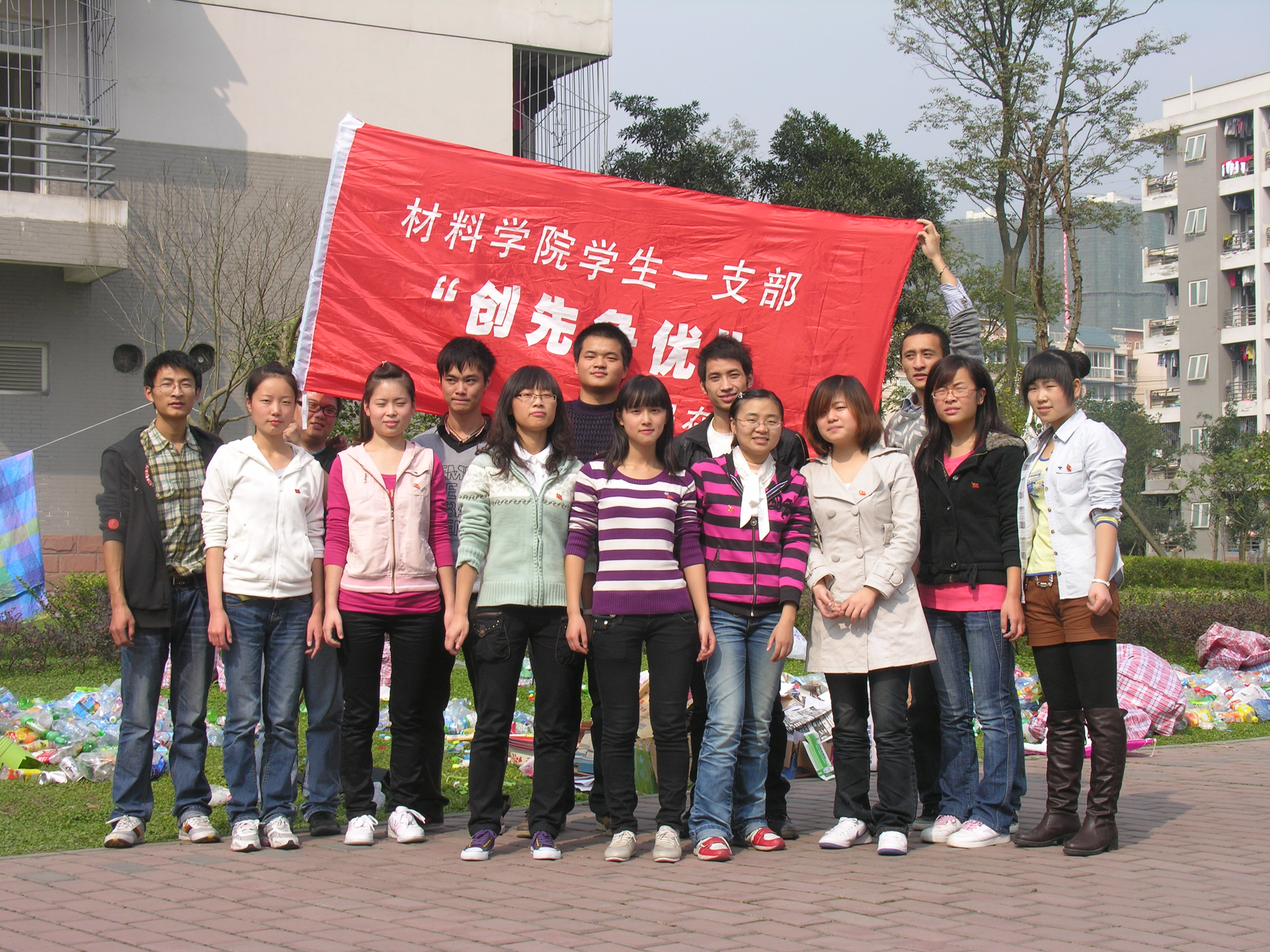 活动一:提倡环保,党员带头收集校园垃圾废品