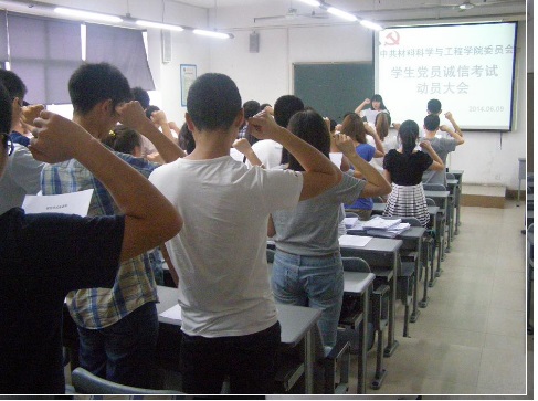 最后党委组织员、2012级第一党支部学生党员代表谭禅发出倡议:她号召在座的党员同志在今后的考试中我们一定要诚实守信,严格遵守考场纪律,杜绝任何形式的舞弊行为,最后,100余名学生党员纷纷在《诚信考试承诺书》上签字,大会气氛热烈,会后学生党员们纷纷表示,在今后的考试中将会继续做好表率,做一名文明诚信的大学生,以优异成绩展现学生党员的风貌。