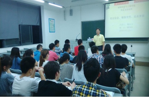 学院党委书记魏远文以“坚定信念、锻炼党性、追逐梦想”为主题,给30位预备党员讲解了身为一名预备党员在思想、学习以及生活等方面上应该具备的素质和承担的职责,他说:一名共产党员就是一面旗帜,这面旗帜一定要时刻坚持马列主义,坚持中国特色社会主义共同理想,坚持以爱国主义为核心的民族精神和以改革创新为核心的时代精神和坚持社会主义荣辱观组成的社会主义核心价值观,希望大家应在思想上加强学习、增强党性、提高自身素质,起到表率作用。