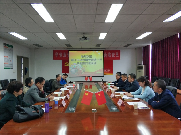 10月19日上午,江苏省靖江市马桥镇党委书记蒋国庆一行来我院考察。在学院会议室,双方就我院与靖江市相关企业合作事宜进行商讨。学院副院长金应荣,实验中心王正云、周廷栋、李铜、陈文静老师,机械学院刘建新教授参加了会议,会议由周廷栋主持。