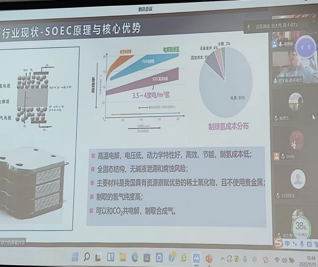 报告会上,吕大伟先生首先介绍了何为质子动力,然后以SOEC行业的现状为切入点,从实战应用的角度讲述了该产品在绿氢行业产业链的定位以及SOEC行业的发展趋势分析,并就存在的问题提出一些思考和未来展望。他指出,氢气储运在我国仍处于发展初期,但其在交通,工业场景以及能源路由器中的运用具有极大的价值。目前中国已经连续多年成为全球第一制氢大国,其中固体氧化物燃料电池(SOFC)与固体氧化物电解池(SOEC)在电解制氢与氢气发电的相互作用上使得我国有望完成我们于2015年巴黎协定承诺降低碳排放的目标。不同于日韩的能源要求,我国的能源需求大,低碳环保要求高,而SOFC和SOEC两项技术实现的氢电相互转化具有效率高,制氢纯度高,且对环境友好,不使用贵金属降价空间大等优点,较大程度上符合我国能源发展的要求。吕大伟先生还提及了的攻关重点是功率要大,耐久度高以及实现量产化降低成本,并希望有更多的有志之士加入到这个行业。