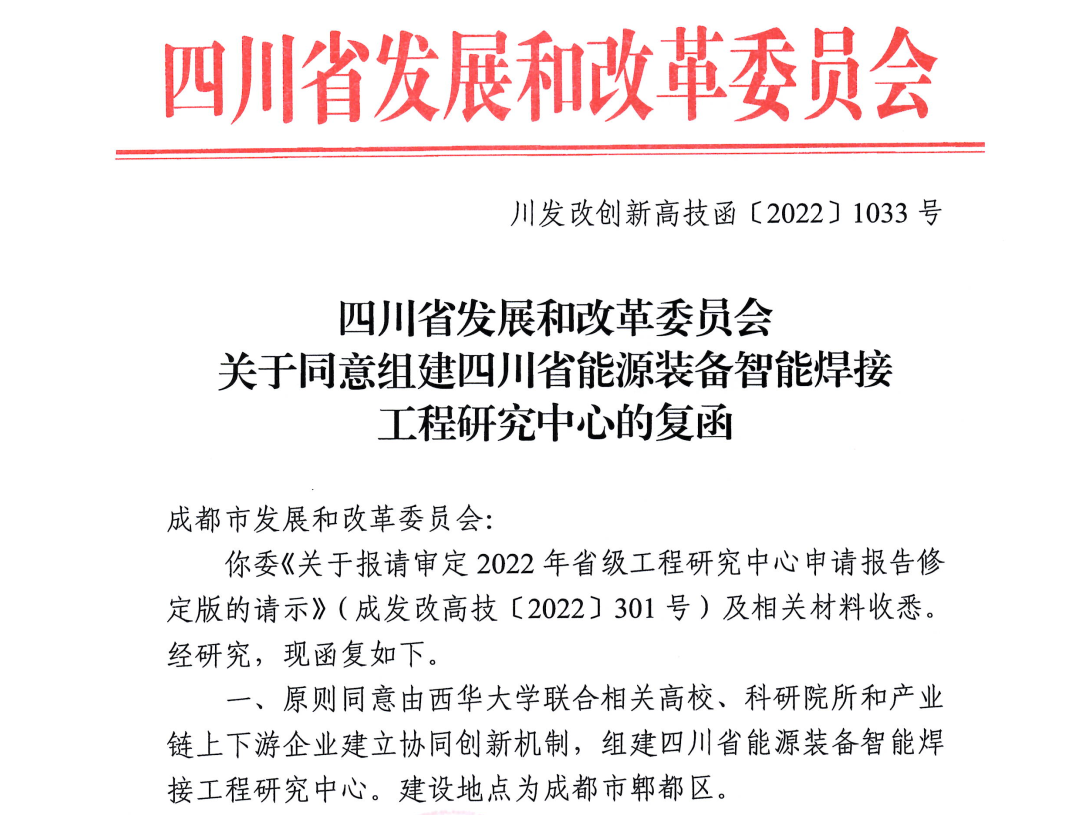 近日,根据《四川省发展和改革委员会关于同意组建四川省能源装备智能焊接工程研究中心的复函》(川发展创新高技函﹝2022﹞1033号),同意由西华大学牵头,联合相关高校、科研院所和产业链上下游企业建立协同创新机制,组建四川省能源装备智能焊接工程研究中心。