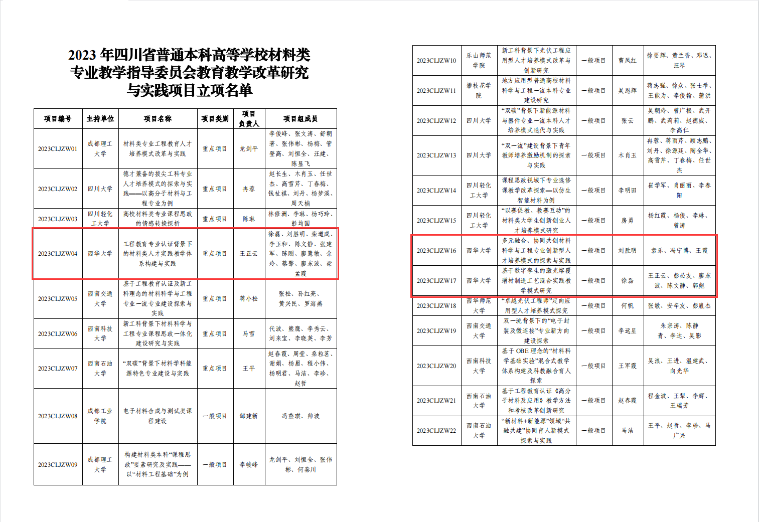 经过学校推荐和专家严格评审,四川省普通本科高等学校材料类专业教学指导委员会近日公布了《关于公布2023年四川省普通本科高等学校材料类专业教学指导委员会教育教学改革研究与实践项目立项名单的通知》,全省22个项目获准立项。其中,我院王正云副院长申报的“工程教育专业认证背景下的材料类人才实践教学体系构建与实践”获批立项重点项目,刘胜明副教授申报的“多元融合、协同共创材料科学与工程专业创新型人才培养模式的探索与实践”和徐磊副教授申报的“基于数字孪生的激光熔覆增材制造工艺混合实践教学模式研究”获批立项一般项目。
