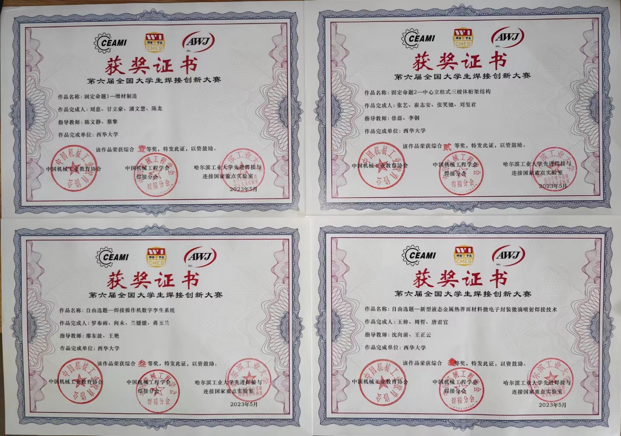 我校焊接技术与工程专业同学紧密结合赛事题目要求,设计作品突出创新特色,面向工程应用,从焊接材料、工艺设计、结构设计、装备智能化等方面出发突出学生专业能力培养,4支队伍创作4项作品参赛并顺利进入决赛。其中刘意,甘立豪,潘文慧,陈龙同学在陈文静、蔡擎老师指导下完成的《增材制造复合板》荣获一等奖; 张艺,刘玺君,崔志安,张笑驰同学在徐磊、李铜老师指导下完成的《中心立柱式三棱体桁架结构》荣获二等奖; 罗布雨,向未,兰媛媛,蒋玉兰同学在廖东波、王艳老师指导下完成的《焊接操作机数字孪生系统》荣获三等奖;王帅,唐宜君,周哲同学在沈向前、王正云老师指导下完成的《新型液态金属热界面材料微电子封装微滴喷射焊接技术》荣获三等奖。