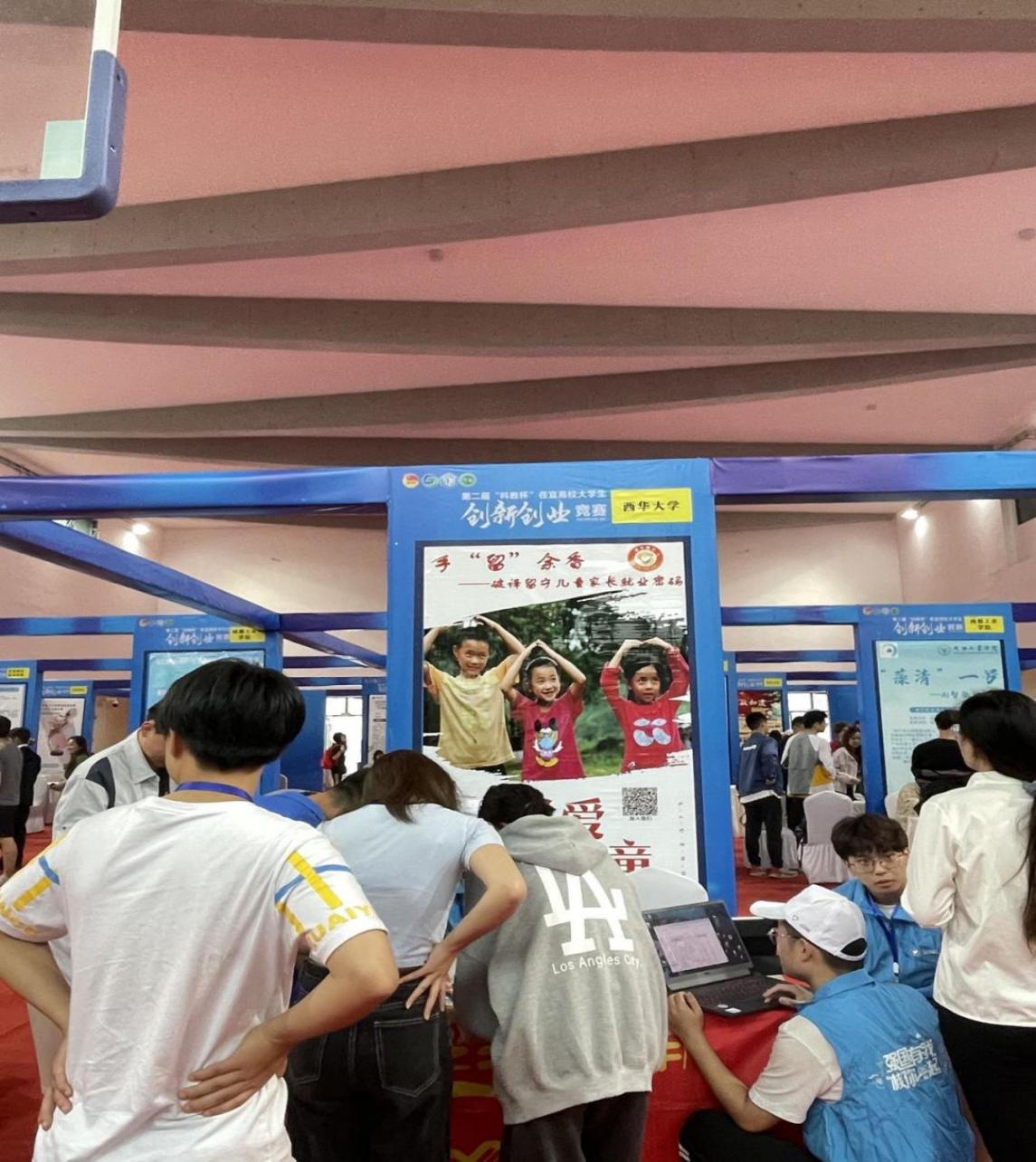 科教杯参展环节,罗杰心、吴子俊、高奉祺、付怡鑫等同学在展台处宣讲公益创业,并将对留守儿童的关爱在参展会上持续传递,让爱只有起点没有终点。