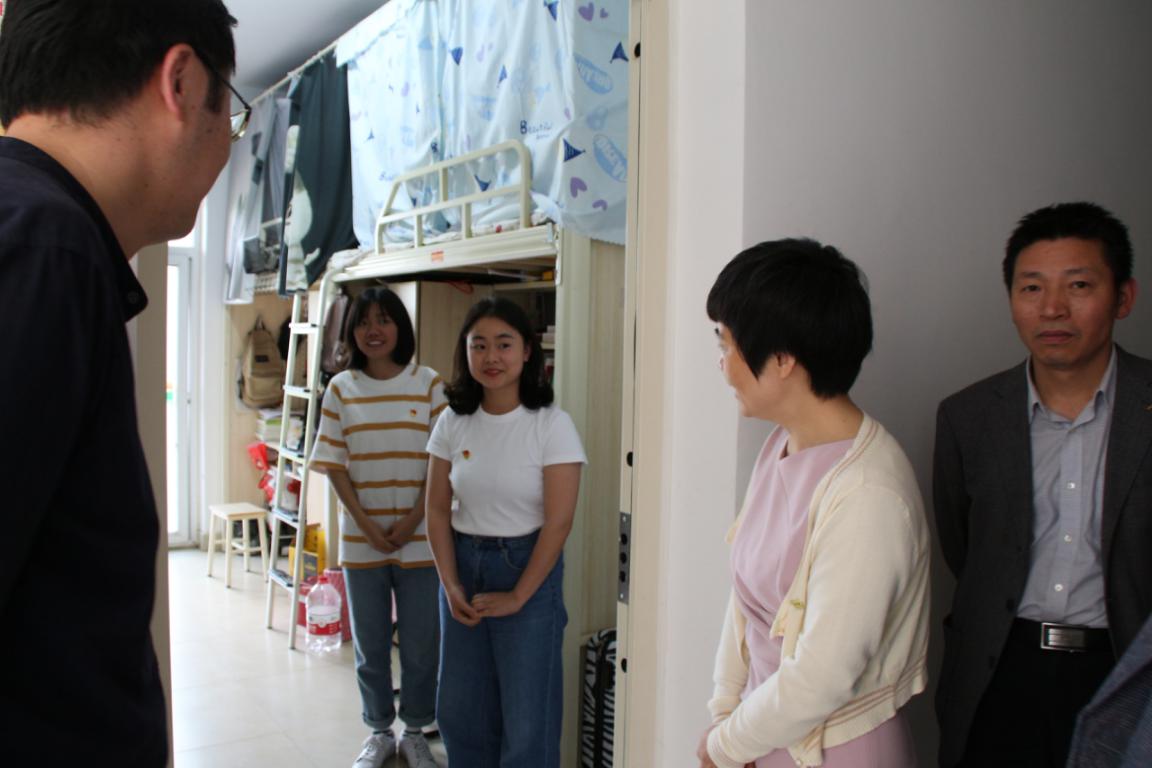领导们来到学生宿舍,与同学们亲切交谈,仔细询问大家在校学习、生活情况,了解学生党员如何在寝室中发挥党员的先锋模范作用。